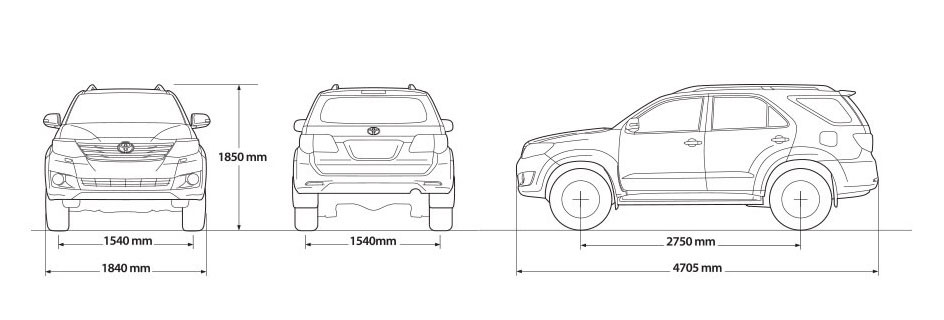 Cá tính và nổi bật là biểu trưng của dòng xe này và được nhiều người biết đến với thương hiệu xe SUV thuộc phân khúc dòng Toyota Fortuner 2017. Khách hàng có thể lựa chọn màu xám sang trọng, màu bạc lịch lãm và màu đen quý phái. Đối với dòng Toyota Fortuner phiên bản nhập khẩu này thì còn có thêm 2 màu mới nữa đó màu trắng ngọc trai và Nâu phantom . Với cải tiến trong lần thiết kế này thì dòng xe bán tải dòng Toyota Fortuner 2017 có tổng chiều dài, chiều rộng và chiều cao lần lượt: 4.705 mm, 1.840 mm, 1.850 mm.