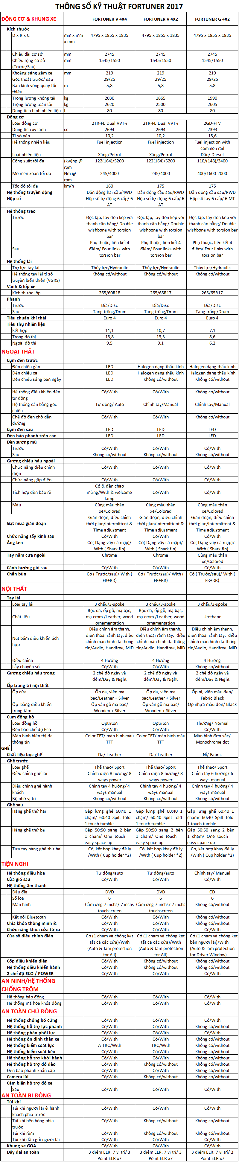 Cùng đó là 3 phiên bản đi kèm đầy cá tính và mạnh mẽ: phiên bản đầu tiên là Toyota Fortuner 2.4G số sàn máy dầu, tiếp đến là Toyota Fortuner 2.7V số tự động máy xăng 1 cầu và dòng Full Option Toyota Fortuner 2.7V số tự động máy xăng 2 cầu, tất cả các phiên bản đáp ứng đầy đủ nhu cầu của khách hàng về dòng xe địa hình SUV gia đình không thể bỏ qua này. Có thể khẳng định rằng Toyota Fortuner 2017 là một tuyệt phẩm của Toyota mang đến cho khách hàng tại Việt Nam.