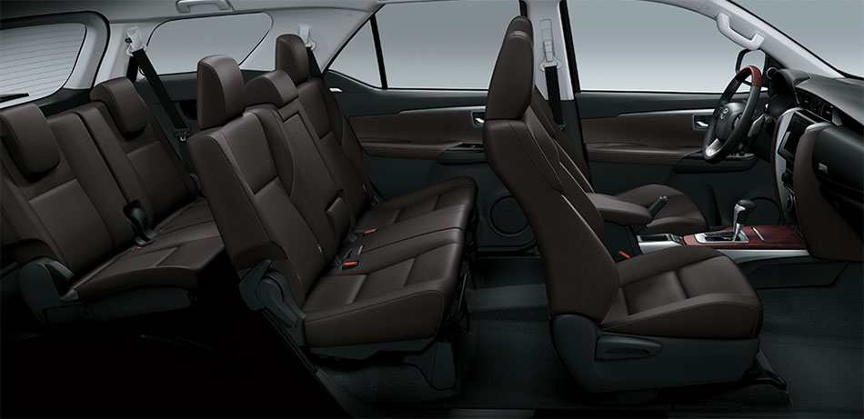 Đi sâu vào bên trong nội thất, Toyota Fortuner 2017 tạo ấn tượng bởi hệ thống ghế ngồi tiện dụng. Các nhà thiết kế chủ yếu mong muốn khách hàng ngồi trên xe một cách thoải mái và thư thái nhất như trong chính trong ngôi nhà của mình. Thế nên hệ thống ghế ngồi của xe Toyota Fortuner 2017 được thiết kế tính năng gập 60:40 với hàng ghế thứ hai và gập 50:50 với hàng ghế thứ ba. Nó hơn hẳn những dòng xe thuộc thế hệ Toyota khác. Hệ thống tay lái 4 chấu được bọc da nhằm tạo vẻ sang trọng.