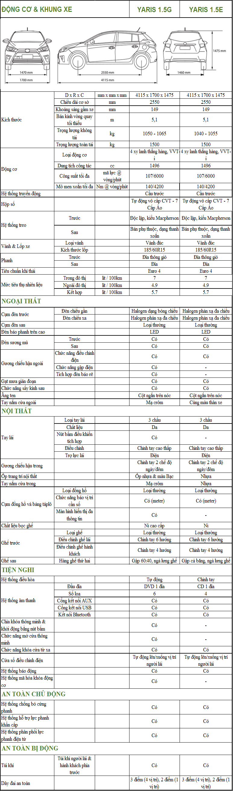 Thông số kỹ thuật TOYOTA YARIS